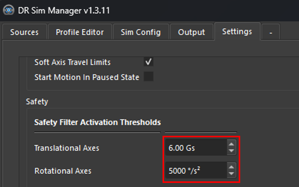 The safety filter protects users by preventing the simulator from generating excessive accelerations or rotations that can feel uncomfortable or unsafe. When incoming telemetry surpasses defined thresholds (default values are typically conservative, such as 3G for translations and 4000 deg/s² for rotations), the safety filter activates, capping motion outputs and logging warnings. Adjusting gains, smoothing, or input limits can prevent frequent activation, ensuring a comfortable and immersive experience without compromising safety.