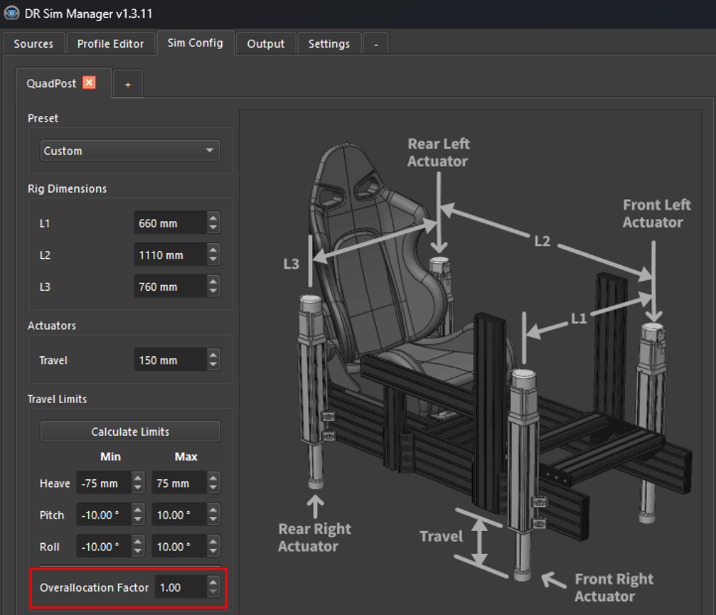 The overallocation factor ensures that quadpost motion simulators maintain stable contact on all four actuators, preventing a condition known as "tripoding," where one actuator lifts off the ground due to uneven loading. Overallocation distributes actuator travel across axes proportionally, but frequent overallocation warnings indicate overly aggressive motion settings, which can break immersion. Adjusting gains or increasing smoothing, especially on heave, pitch, and roll axes, helps reduce these warnings, resulting in smoother and more stable motion cues.