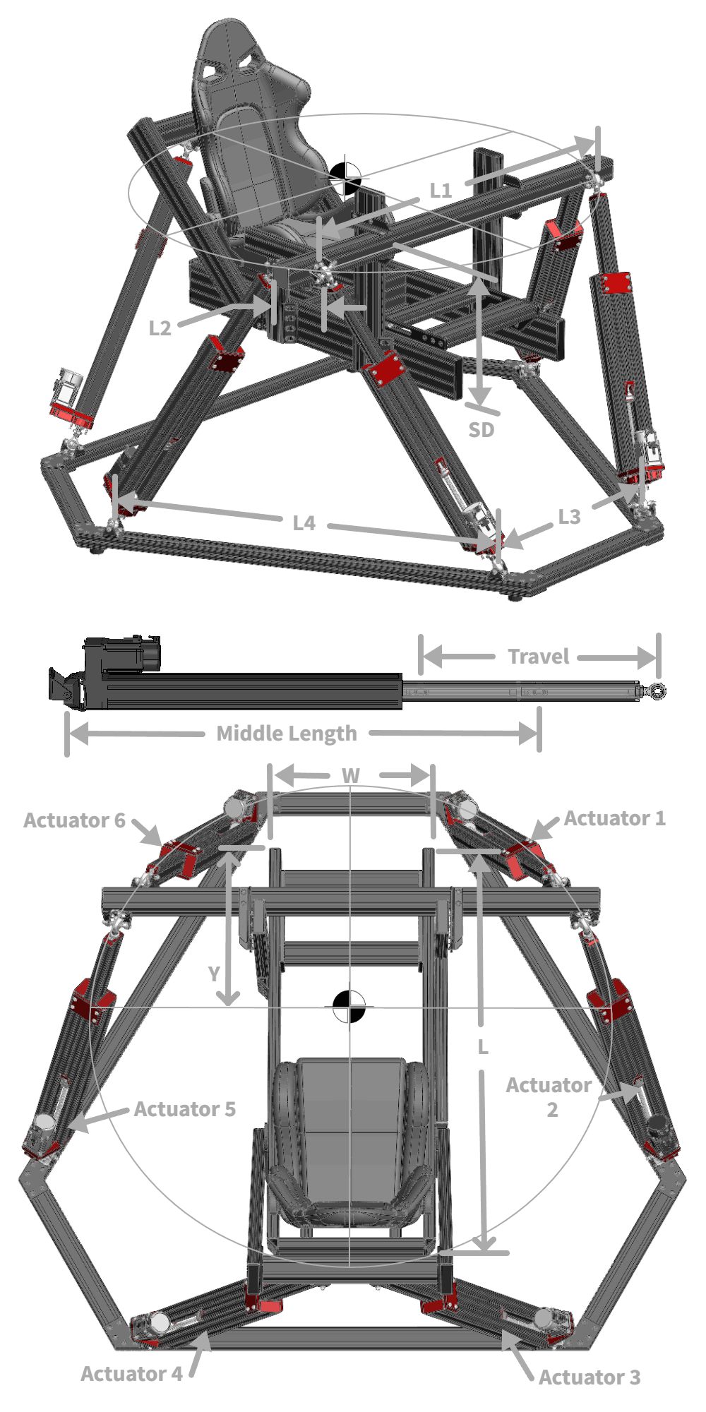 The Linear Hexapod simulator allows you to configure and visualize a 6-DOF (Degrees of Freedom) motion platform using linear actuators arranged in a hexapod configuration. The simulator provides controls for rig dimensions, actuator specifications, and motion limits.